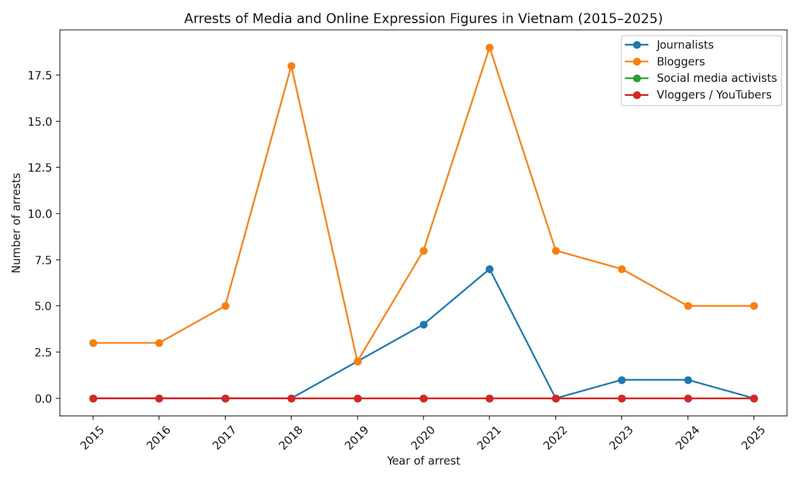 Arrests linked to journalism and online expression in Việt Nam increased sharply in 2018 and continued to grow in the years that followed, according to data compiled from court records, human rights groups, and media reports covering the period from 2015 to 2025.